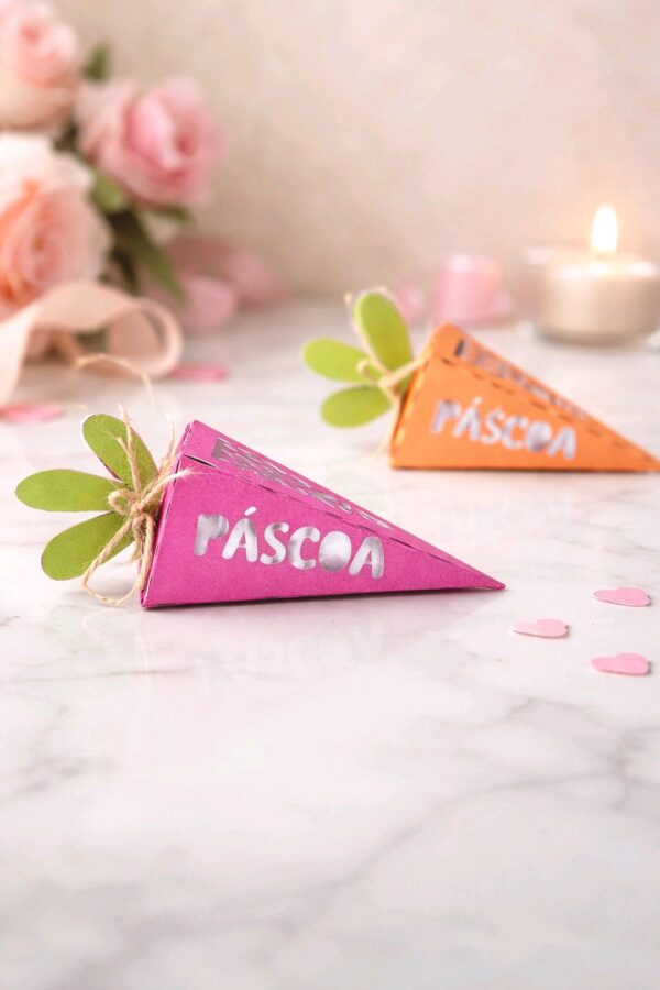 Encante seus clientes e amigos com esta Caixa Pirâmide Cenoura, um projeto de papelaria criativa pensado para unir delicadeza e facilidade de montagem. O grande destaque desta peça é o detalhe vazado com a frase “Feliz Páscoa”, que cria um efeito visual único, permitindo que a cor do recheio ou de um papel interno complemente o design.