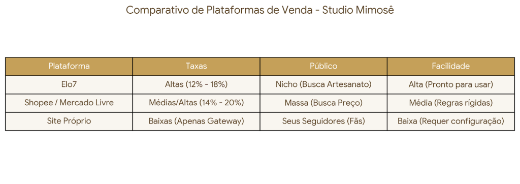Todas as Categorias Shopee, Elo7 ou Loja Virtual? O comparativo sincero de onde vale a pena vender artesanato em 2026 por Lígia Rubia - Publicitária e Maker por Lígia Rubia - Publicitária e Maker Bookmark 22 Quando a gente decide vender na internet, dá uma tontura. São tantas opções, tantas taxas, tantas regras… Shopee, Elo7, Mercado Livre, Amazon, Site Próprio, Instagram Shopping.A pergunta que não quer calar é: Onde eu coloco minha energia (e meu dinheiro)?Sou a Lígia Rubia, publicitária e fundadora do Studio Mimosê. Antes de abrir minha loja, passei meses estudando o comportamento do consumidor. E a conclusão que cheguei pode te surpreender: não existe a plataforma “perfeita”, existe a plataforma certa para o seu momento. Hoje, vamos fazer um “Raio-X” sincero das principais opções para quem trabalha com artesanato, velas e decoração, para você não perder tempo (nem dinheiro) no lugar errado. 1. Elo7: O Shopping do ArtesanatoDurante anos, o Elo7 foi a casa do artesão brasileiro. É um marketplace focado 100% em produtos criativos e personalizados.👍 Vantagens: O público que entra lá já quer artesanato. Eles não acham estranho esperar 10 dias de produção. É um ambiente seguro para quem está começando e tem medo de tecnologia, pois a loja é fácil de montar.👎 Desvantagens: O tráfego (número de pessoas visitando) caiu muito com a chegada dos gigantes asiáticos. Além disso, a taxa de comissão é alta (quase 20% em alguns casos), o que come boa parte do seu lucro.Veredito: Bom para testar seus primeiros produtos e para nichos muito específicos (como lembrancinhas de festa infantil). 2. Shopee e Mercado Livre: Os Gigantes do TráfegoAqui é onde a massa está. Todo mundo tem o app da Shopee instalado.👍 Vantagens: O volume de gente é absurdo. Se você acertar a palavra-chave, vende dormindo. O sistema de frete (cupons de frete grátis) é um atrativo enorme que nós, sozinhas, não conseguimos bater.👎 Desvantagens: A “Guerra de Preço”. Lá, seu produto Premium de R$ 80,00 vai aparecer do lado de um produto importado de R$ 15,00. É difícil justificar valor. O público lá quer preço e rapidez. Se você faz produtos personalizados que demoram para ficar prontos, pode ter problemas com a reputação de envio.Veredito: Excelente para produtos de entrada (mais baratos) ou para girar estoque rápido. Mas cuidado para não desvalorizar sua marca entrando na guerra de preços. 3. Site Próprio (Loja Virtual): A Sua Casa PrópriaTer um site (seja Nuvemshop, Bagy, Shopify, Woocommerce) é o sonho da independência.👍 Vantagens: Branding Puro. No seu site, não tem concorrente do lado. Você define o layout, as cores, os banners. Você tem o e-mail do cliente (nos marketplaces, os dados não são seus). É a única forma de criar uma marca de luxo real, como fazemos no Studio Mimosê.👎 Desvantagens: Você está no meio do deserto. Se você não fizer marketing (Instagram, TikTok, Tráfego Pago), ninguém vai entrar na sua loja. Diferente da Shopee, onde o cliente “tropeça” no seu produto, no site próprio você tem que levar ele até lá.Veredito: Essencial para quem quer construir marca a longo prazo e fidelizar clientes. É o objetivo final de toda artesã profissional. A Estratégia da Lígia: O “Pulo do Gato”Não coloque todos os ovos na mesma cesta. A estratégia mais inteligente para 2026 é ser Omnichannel (estar em vários canais), mas com objetivos diferentes:Use os Marketplaces (Shopee/Mercado Livre) como “Isca”: Venda produtos mais simples e baratos lá para ganhar visibilidade. Quando enviar a encomenda, mande um cartão lindo convidando o cliente para conhecer seu Site Oficial (onde estão as peças exclusivas e mais caras).Use o Site Próprio como “QG”: É para lá que você manda seus seguidores do Instagram. É lá que você lança as coleções limitadas e trabalha o High Ticket (produtos caros). Conclusão: Comece onde é possível, mire no impérioSe você tem zero reais para investir agora, comece na Shopee ou Elo7. Valide seu produto. Venda as primeiras 10 velas. Mas não se acomode. O objetivo de toda empresária artesã deve ser ter seu próprio domínio (www.suamarca.com.br), onde você dita as regras.No Studio Mimosê, nós prezamos pela experiência. E não há experiência mais chique do que receber o cliente na sua própria casa digital.E você, onde está vendendo hoje? Me conta aqui nos comentários! Sobre a AutoraLígia Rubia Publicitária & Founder do Studio MimosêEspecialista em Marketing e apaixonada pelo feito à mão, Lígia ajuda artesãs a transformarem talento em negócios lucrativos. No comando do Studio Mimosê, aplica estratégias de grandes marcas no universo do Handmade Premium.📷 Instagram: @oficialligia | 🛍️ Loja: @studiomimose 0 comments 0 FacebookTwitterPinterestEmail Lígia Rubia - Publicitária e Maker Follow Author Ligia Rubia é publicitária, maker e especialista em DIY. Compartilha dicas, tutoriais e inspirações em www.ligiarubia.com.br e no Instagram @oficialligia. Acredito que a arte transforma a vida!" Por isso, defendo que a criatividade não é apenas uma profissão, mas uma forma de expressão, cura e conexão com nossa essência mais verdadeira! previous post Mais que Likes: Como transformar seguidores em clientes reais no Instagram do seu Ateliê next post Vitrine de Milhões: Como tirar fotos de artesanato que vendem (usando apenas o seu celular) You may also like Corantes, Micas e Pigmentos: O Guia Definitivo para... Bookmark O Guia Definitivo dos Pavios: O “Motor” da... Bookmark Socorro, minha vela ficou feia! Guia SOS para... Bookmark A Matemática do Pavio: Como escolher o tamanho... Bookmark A Batalha dos Pavios: Algodão ou Madeira? Qual... Bookmark Por que minha vela não tem cheiro? Os... Bookmark Parafina, Coco, Palma ou Soja? O Guia Definitivo... Bookmark O Poder do Unboxing: Como criar uma embalagem... Bookmark Vitrine de Milh
